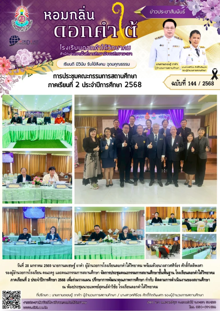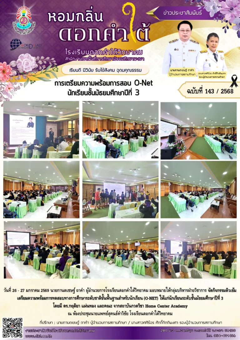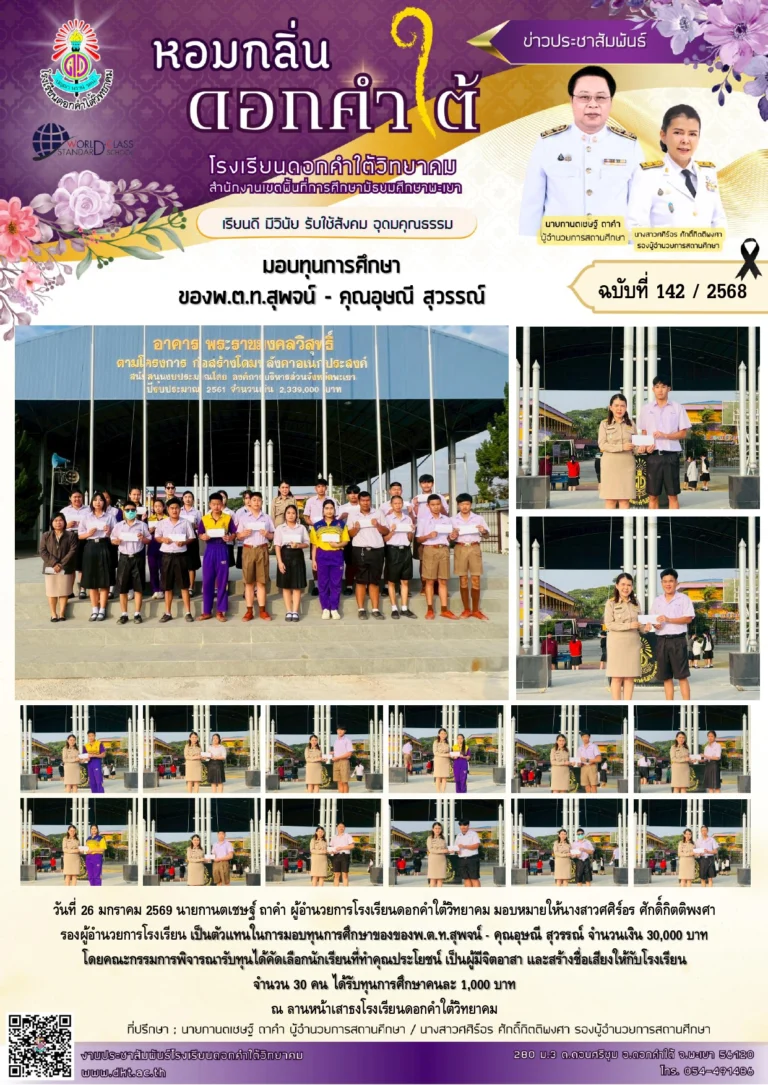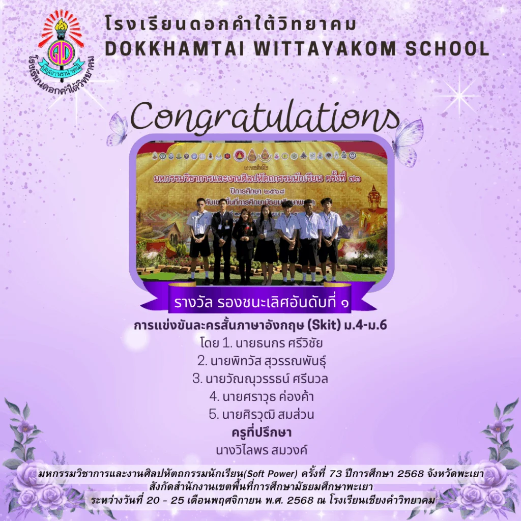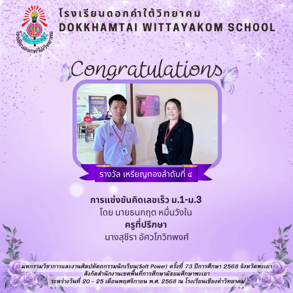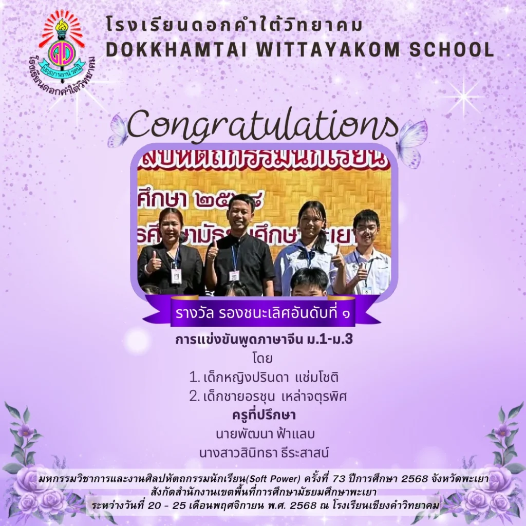 โรงเรียนดอกคำใต้วิทยาคมสร้างความภาคภูมิใจอีกครั้ง ด้วยผลการแข่งขัน มหกรรมวิชาการและงานศิลปหัตถกรรมนักเรียน (Soft Power) ครั้งที่ 73 ปีการศึกษา 2568 จังหวัดพะเยา สังกัดสำนักงานเขตพื้นที่การศึกษามัธยมศึกษาพะเยา ณ โรงเรียนเชียงคำวิทยาคม ระหว่างวันที่ 20–25 พฤศจิกายน 2568