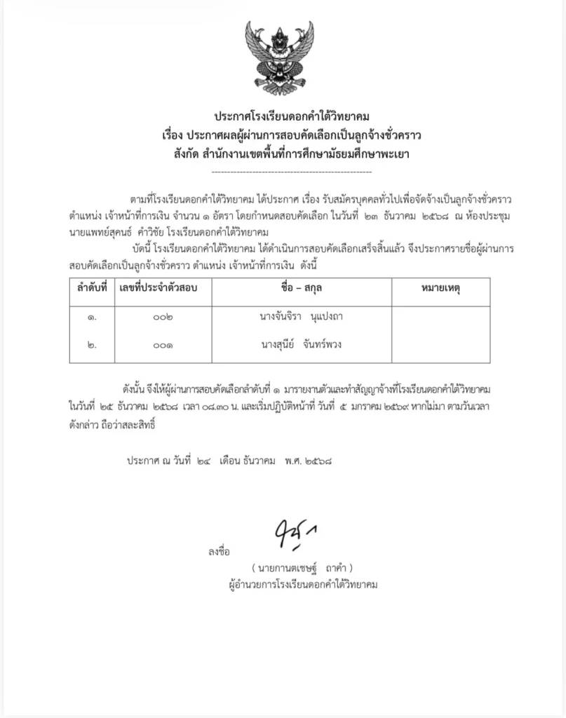 ประกาศผลผู้ผ่านการสอบคัดเลือกเป็นลูกจ้างชั่วคราว